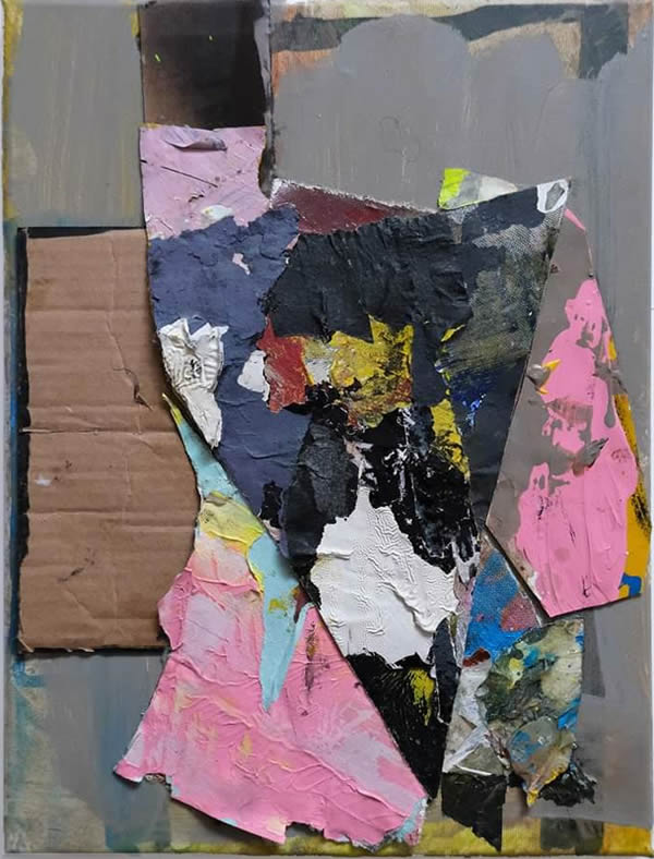 EC, Registered Interruption , oil, household gloss, acrylic on canvas, paper and card on stretched canvas, 51 x 41 cm, 2019