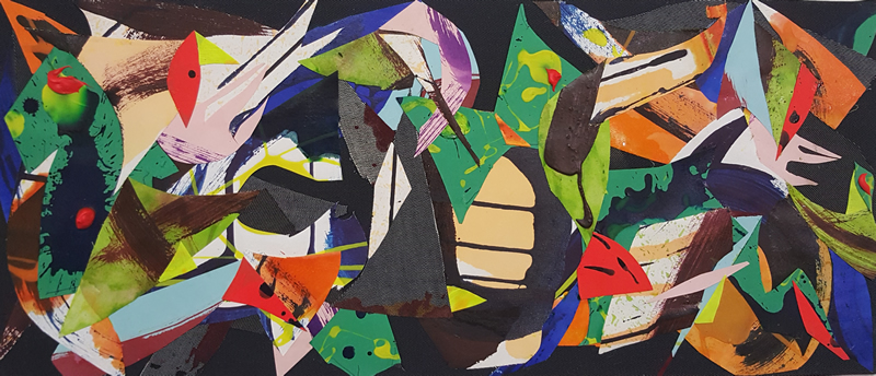 John Bunker, Take me in the Night to the house I never knew , 2021, acrylic, ink, collaged canvas, coloured papers on denim on board, 30.5 x 70 cm