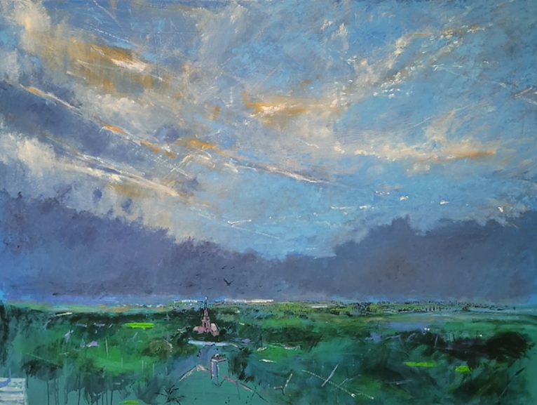 The work focuses on the interplay between urban landscapes and the natural world, drawing inspiration from the ever‐changing scenery along the river Thames and the panoramic views and big skies over the city from my garden.